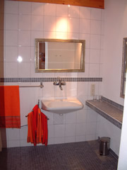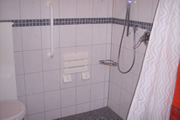 | Von Ihrem Parkplatz (direkt vor der Eingangstüre) gelangen Sie ebenerdig in die Ferienwohnung. Die allgemeine Türbreite beträgt 79 bis 82 cm, Haustüre 90 cm. Die Dusche im Bad ist befahrbar, ein Duschklappsitz und Haltegriffe sind vorhanden. | ![]() |