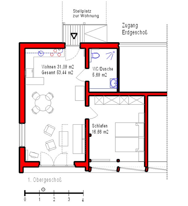 | Die Küche ist in großzügiger Bauweise zum Ess- und Wohnbereich offen. Der Autostellplatz liegt direkt vor der Haustüre, welche ebenerdig in die Wohnung führt. | |